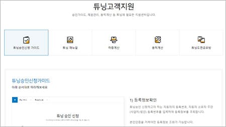 - 튜닝서비스 : 사이버검사소에서는 자동차 튜닝 관련 서비스도 제공하고 있습니다. 튜닝을 하고자 하는 차량의 등록 정보를 조회하고, 튜닝 승인 신청을 할 수 있습니다. 튜닝 승인 신청 시 튜닝 구조 및 장치에 대한 안전성 확보를 위해 관련 서류를 제출해야 합니다. 공단에서는 이를 검토하여 승인 여부를 결정하게 됩니다.