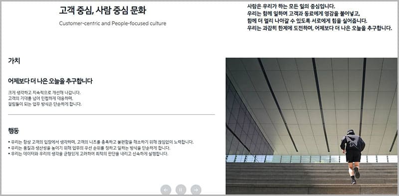 - 지원제도 : 스마트오피스&워크, 출퇴근 통근버스, 재충전의 지원
