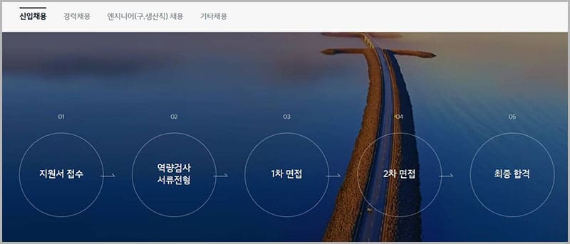 기아자동차는 신입채용, 경력직채용, 엔지니어(구, 생산직) 채용, 기타 채용 등으로 분류되어 있으며, 각 분류별로 채용 프로세스가 약간씩 다르니 지원하기 전에 반드시 자신에게 맞는 프로세스를 알아보시기 바랍니다.