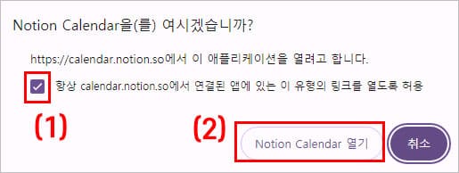 위의 이미지와 같이 체크한 후, ‘Notion Calendar 열기’ 버튼을 눌러 주세요. 이는 앞으로 노션 캘린더는 웹브라우저가 아니라 프로그램을 통해 사용하겠다는 의미입니다.