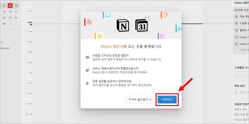 노션 캘린더 프로그램이 처음으로 실행되면 위와 같은 화면이 나오는데요. ‘시작하기’ 버튼을 눌러 구글 계정과 연동된 노션 캘린더를 시작할 수 있습니다.