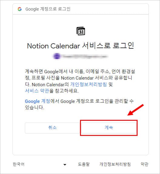 용도에 맞게 구글 계정을 선택하면, 위와 같이 구글 계정을 통해 Notion Calendar 서비스로 로그인하는 연동 과정을 거치게 됩니다.