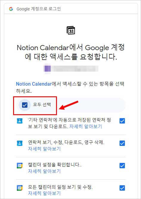 위와 같이 ‘모두 선택’을 누르면, 노션 캘린더에서도 구글 캘린더와 비슷한 설정을 할 수 있게 됩니다. 저는 모두 선택을 하고 맨 아래에 있는 ‘계속’ 버튼을 누르겠습니다.