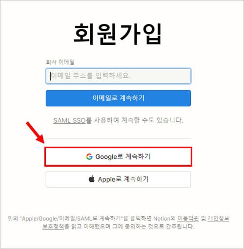 노션 홈페이지 접속한 후, 맨 위 오른쪽 상단에 보면 ‘무료로 Notion 사용하기’ 버튼이 있습니다. 그 버튼을 클릭하면, 위의 노션 회원가입 페이지로 이동합니다. 구글이나 애플 이메일로 시작할 수 있는데, 제 휴대폰은 안드로이드 폰이라 ‘Google로 계속하기’ 버튼을 눌러 구글 계정으로 노션을 사용하겠습니다. 저와 같이 안드로이드 휴대폰을 사용하시는 분은 해당 구글 계정으로 가입하시면 나중에 노션 캘린더와 구글 캘린더를 연동할 때 훨씬 수월합니다.