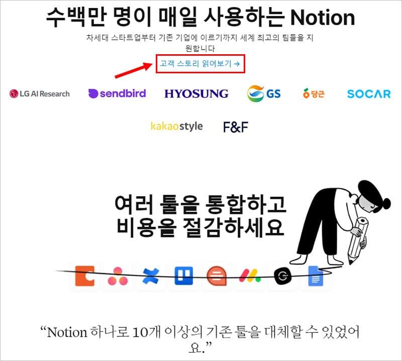노션 고객스토리에서는 각 회사나 팀의 노션 활용 방법을 소개합니다. 또한 기존의 프로젝트나 협업 툴을 대체하여 시간을 절약하고 안정을 되찾은 회사들의 사례를 참고할 수 있습니다.