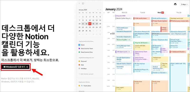 자 이제 노션 캘린더를 설치한 후에 구글 캘린더와 연동할 차례입니다. 노션 캘린더 windows용 프로그램을 다운로드해 주세요. 위의 이미지를 누르거나, 아래 바로가기 버튼을 클릭하면 바로 이동합니다.