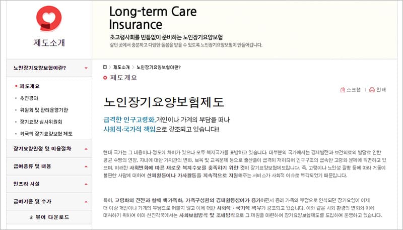 국민건강보험공단에서 주관하는 노인장기요양보험제도에 대해 자세하게 알 수 있습니다. 기본적으로 본 제도는 사회변화에 따른 새로운 복지수요를 충족하기 위한 것으로, 급격한 인구고령화를 개인이 아닌 사회적 또는 국가적으로 책임지기 위한 것입니다.