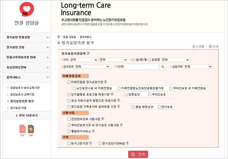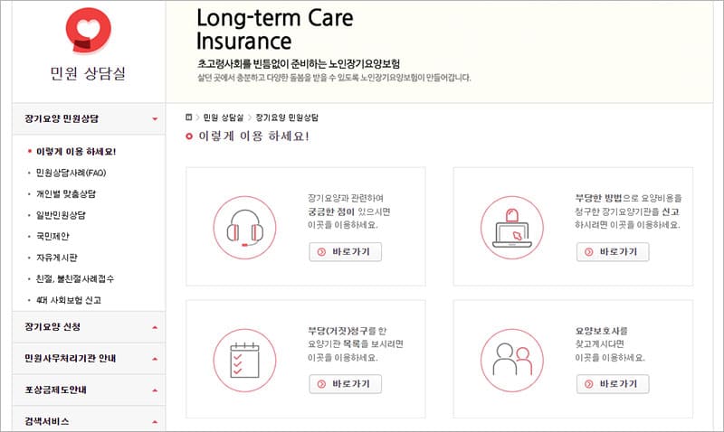 장기요양보험과 관련된 다양한 민원 상담을 할 수 있는 메뉴입니다. 부당 청구 장기요양기관 신고 및 리스트를 볼 수 있으며, 자신이 거주하는 지역의 전문 요양보호사를 찾고 싶을 때 편리하게 찾을 수 있습니다.
