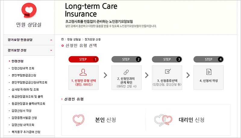 장기요양 인정신청을 하는 페이지입니다. 본인 혹은 대리인이 신청할 수 있으며, 이전에는 자녀 또는 부양가족이 대리인 자격으로 신청하는 경우가 대부분이었습니다. 요즘은 본인이 직접 신청하는 경우도 많아져서 장기요양보험 홈페이지에서 바로 신청하시면 됩니다. 장기요양 신청을 위해서는 먼저 회원가입 및 로그인을 하셔야 하니 참고하시기 바랍니다.