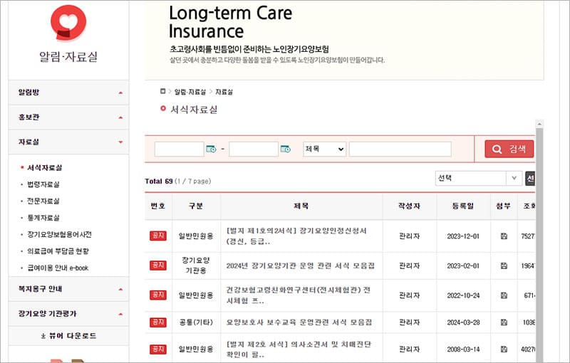 장기요양인정신청서, 요양보호사 보수교육 운영관련 서식, 심사청구서 및 심사청구취하서 등 다양한 서식 자료를 다운로드할 수 있습니다. 특히 장기요양보험 인정신청을 하실 경우 이곳에서 관련 서식을 다운로드하시기 바랍니다.