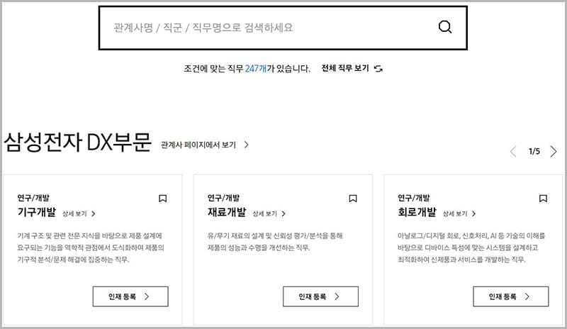 삼성 채용 홈페이지 직무 찾기 페이지는 삼성 관계사의 다양한 직무를 쉽게 찾을 수 있도록 검색 기능을 제공하고 있으며, 구직자들은 직무에 대한 임직원 인터뷰, 직무 설명, 수행 업무 및 필요 역량 등에 대해 자세하게 알 수 있습니다.