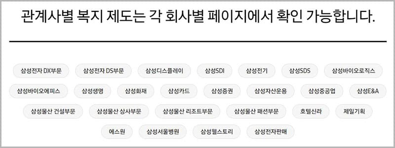 삼성은 임직원의 더 나은 내일과 미래를 위해 다양한 복지 제도를 운영하고 있는데요. 사내 문화 및 편의 시설, 본인 및 가족 의료 및 소득 지원, 자기 계발 지원 등 즐겁고 활력 있는 회사 생활이 될 수 있도록 최선을 다해 지원하고 있습니다. 또한 각 관계사별로 복지 제도는 조금씩 다를 수 있으니, 복지 제도 페이지 하단에 있는 관계사별 복지 제도를 참고해 주시기 바랍니다.