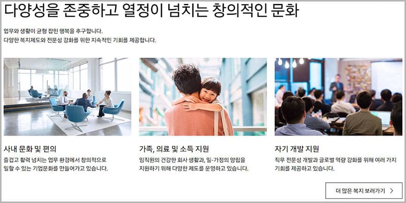 - 사내 문화 및 편의 : 사내병원, 사내식당, 사내 피트니스, 통근버스, 기숙사, 문화행사, 사내동호회, GWP(Great Work Place), 휴양소 지원