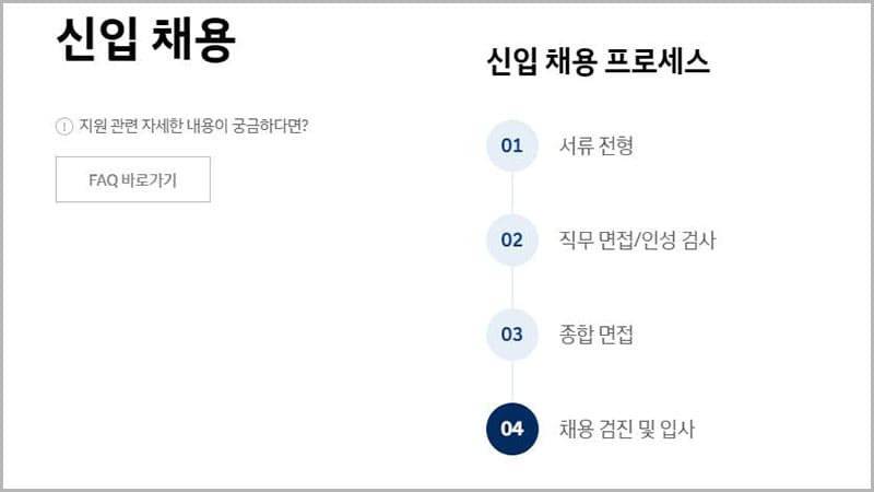 - 신입 채용 : 서류 전형 – 직무 면접/인성 검사 – 종합 면접 – 채용 검진 및 입사
