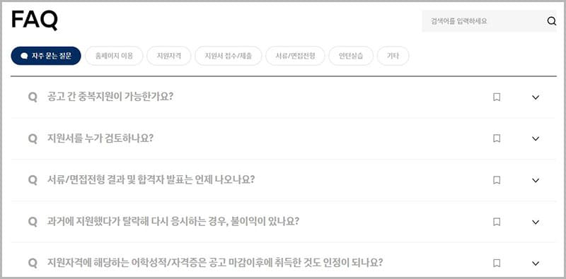 채용 프로세스 페이지에서는 신입, 경력직, 인턴십으로 분류됩니다. 공통적으로 처음 서류전형과 직무 면접 및 인성 검사를 진행하며 이후에는 분류별로 약간씩 다르게 진행되며, 각 채용별로 모집 시기 및 지원 자격 조건에 대해 설명하고 있으니 지원하시는 분들은 참고하시기 바랍니다. 또한 분류별 자주 묻는 질문(FAQ)을 함께 운영하고 있으니, 궁금한 사항은 이곳을 통해 알아보시기 바랍니다.