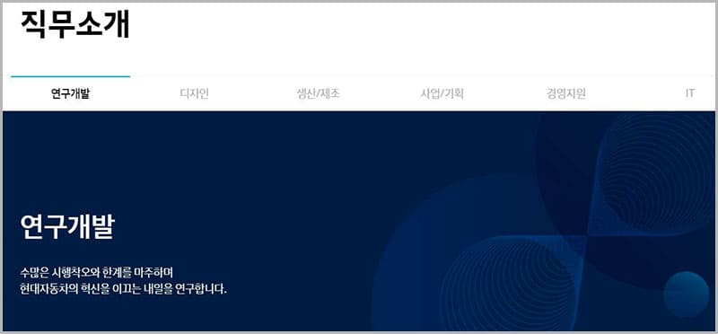 현대자동차는 다양한 직무를 통해 지원자들에게 폭넓은 기회를 제공하고 있으며, 연구개발, 디자인, 생산/제조, 사업/기획, 경영지원, IT로 나누어져 있습니다.