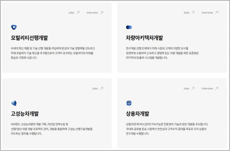 - 연구개발 : 모빌리티선행개발, 차량아키텍처개발, 고성능차개발, 상용차개발, 차량설계, 차량시험, 전동화설계, 전동화시험, 차량제어개발, 전자개발, 인포테인먼트개발, 자율주행, 로보틱스, 소재개발, 수소연료전지, 배터리, 반도체, 미래 모빌리티, 디지털엔지니어링, 연구개발기획, 연구개발 품질/법규인증, 파이롯트
