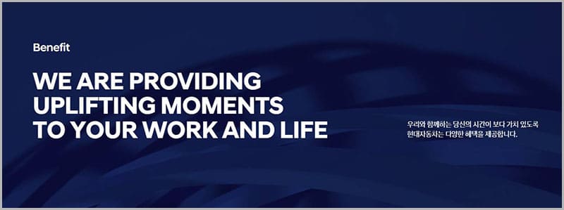 현대자동차는 직원들의 시간이 보다 가치 있게 사용될 수 있도록 다양한 복지 제도 및 혜택을 제공합니다. 크게 Work, Wellbeing, Career로 나누어 다양한 프로그램을 운영하고 있습니다.